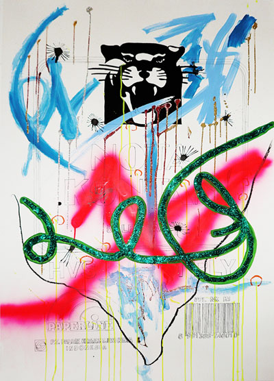 | 61 - Cohabitation Peinture acrylique, encre de Chine, peinture en spray, paillettes sur papier - 50/105cm - 2010 |