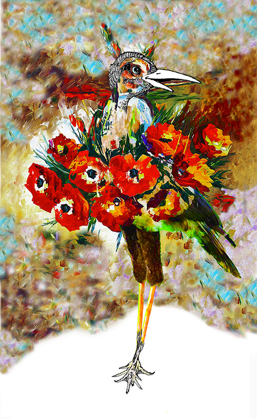 | Je présente ici une composition faite de fleurs, de 3 parties différentes de corps d'oiseaux et d'un dessin de la tête de ce dernier. Je voulais en premier lieu faire un collage puis dessiner la tête, mais j'ai été accroché, rattrapé par la présence de cet oiseau, alors j'ai commencé à travailler sérieusement sur toutes les autres parties de la composition. J'ai donc réalisé, de mon point de vue et de mon expérience, une véritable peinture numérique, utilisant différents pinceaux, couleurs et motifs dont je disposais sur Photoshop. Je laisse quelques indications visuelles de la technique que j'ai utilisée, exprès, car je considère que ces petits défauts font partie à part entière de la création sur ordinateur. Je ne prétends pas que c'est de la peinture sur toile bien que ce soit la première origine de cette création, trouvée au détour de recherches génériques sur google. Je préfère donc embellir les accidents numériques (avec des pixels, des filtres ou du copier / coller) comme s'il s'agissait d'un véritable matériau physique. Quand j’ai terminé la première composition, j’ai décidé de l'appeler « Le roi des oiseaux ». Il pourrait représenter à mes yeux le symbole de la liberté, mais pas n'importe quelle sorte de liberté: notre propre liberté personnelle, faite de tous nos défauts, qualités, espoirs et force, défaites et victoires. Rapidement j’ai décidé de lui trouver une Reine, et des sujets… |