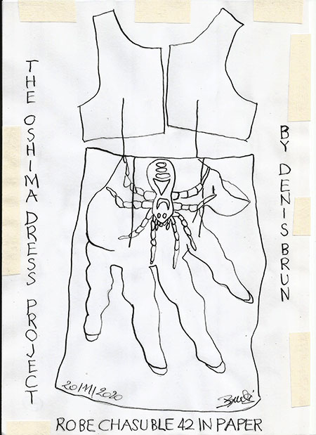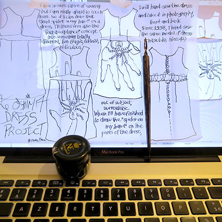 My esquisse proposal will be to draw (with marker or ink with brush) dress patterns on a big sheet of white paper. I will draw a dead spider on a hand, front and back and upside down. Why ? Because in 2016 when I participate to Tokyo Art Island Festival, I did a picture with a big dead spider in my hand, and I love that picture. I have a fake big spider in plastic, so I will use it as a model for the drawing session. So, if I can draw that "dead spider in my hand" on a dress, I'll transform also the "fear acceptance" concept into someting totally different, fun-tragic, ridiculous, out of subject, surrealistic, dadaïst. The important thing to know is that I'M NOT A GOOD DRAWER so that exercise for me will be quite difficult. Then when I'll have finished to draw the "spider on my hand" on the parts of the dress, I will hand-sew the dress and take it in photography, front and back. ORIGINS OF MY WORK ON DRESSES Since 1998, I hand-sew the same model of dress (chasuble, size 42). Only the hems of the 8 different parts of the dress are sewn on the sewing machine. It’s my own reflexion about the possibilities of evolution of a garment : each time you create it, you change one thing (the textile, the front lenght, the back lengh, you add long sleeves, a hoodie, etc...) then, from the same shape you create a range of possibilities. I considere that work as experimental fashion/low-couture/ sculpture/contemporary art. I really like Martin Margiella, Hussein Chalayan and Walter Van Beirendonck as well as Jeremy Schott or Alexander Mc Queen. |